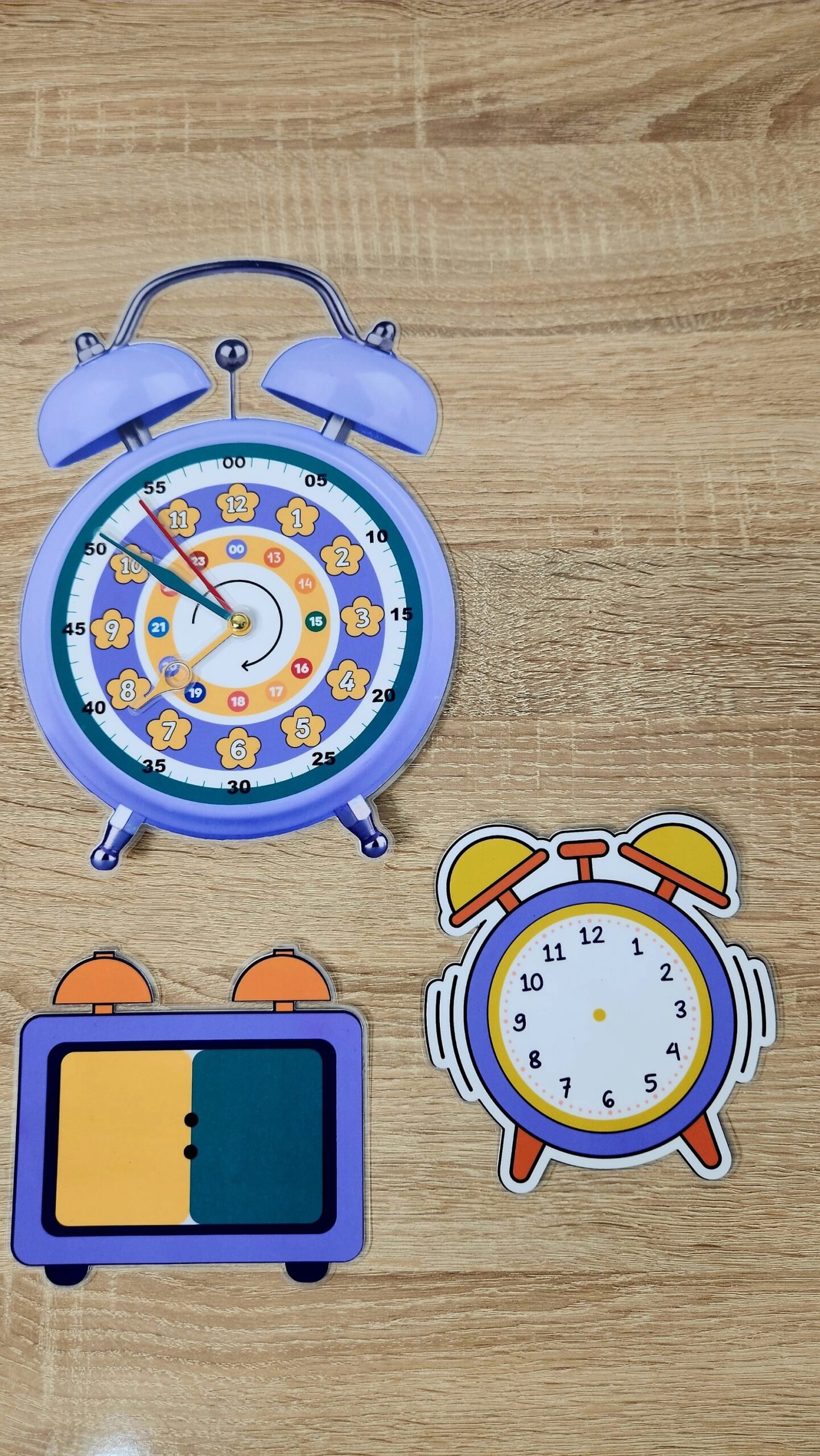 تحتوي الساعة على عقارب متحركة يمكن للطفل تحريكها بنفسه، مما يساعده على الربط بين حركة العقارب والوقت الحقيقي.