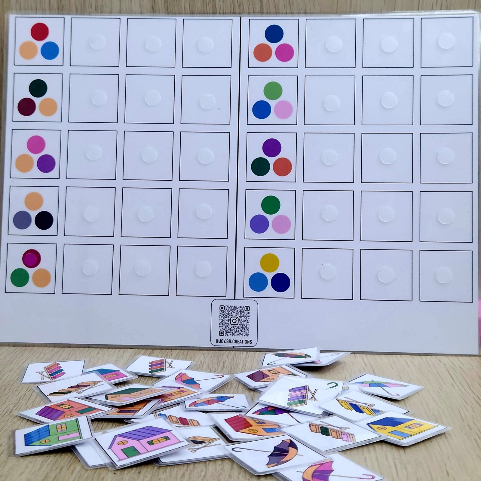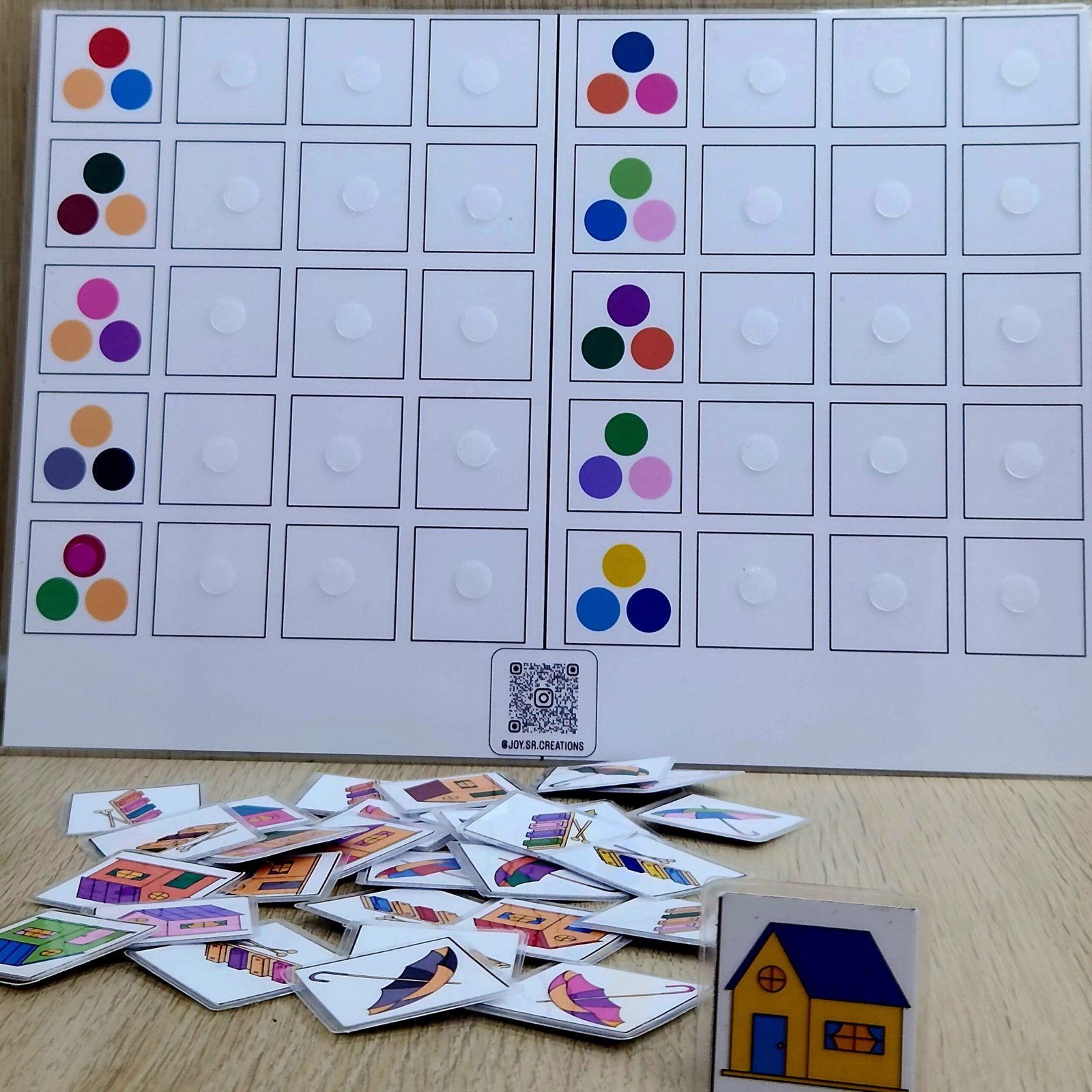 يعتمد النشاط على بطاقات مصوّرة (منزل، مظلة، زيليفون…) يقوم الطفل بوضعها في المكان الصحيح داخل لوحة الألوان المطابقة.